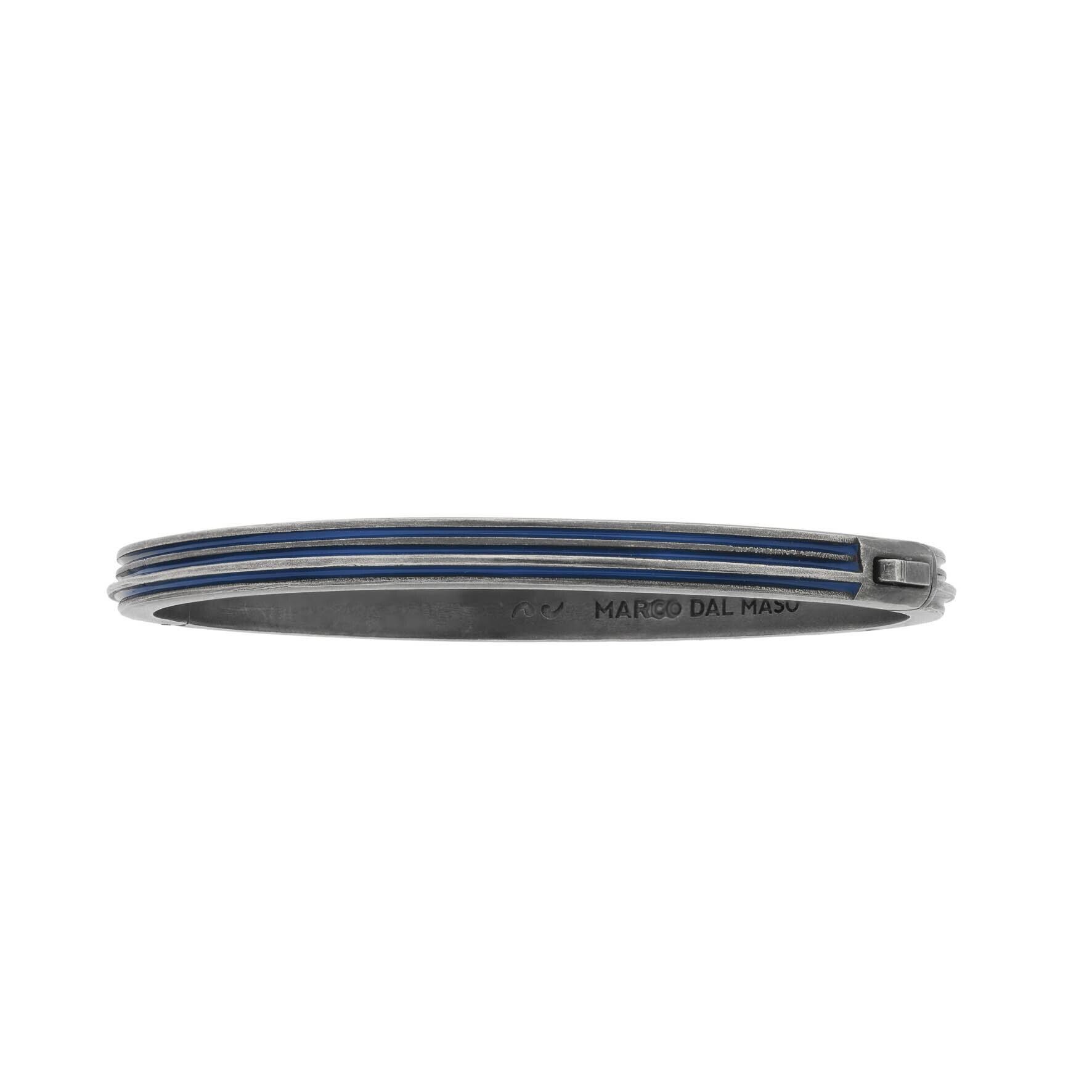 4本の線を重ね、ブルーエナメルでアクセントをつけたスタイリッシュなバングル。4本のうち1本高さを変えて強弱をつけたデザインとなっています。クラスプは片手で簡単に取り外し可能。腕にずっしりとくるこの感じが生きている証である。
