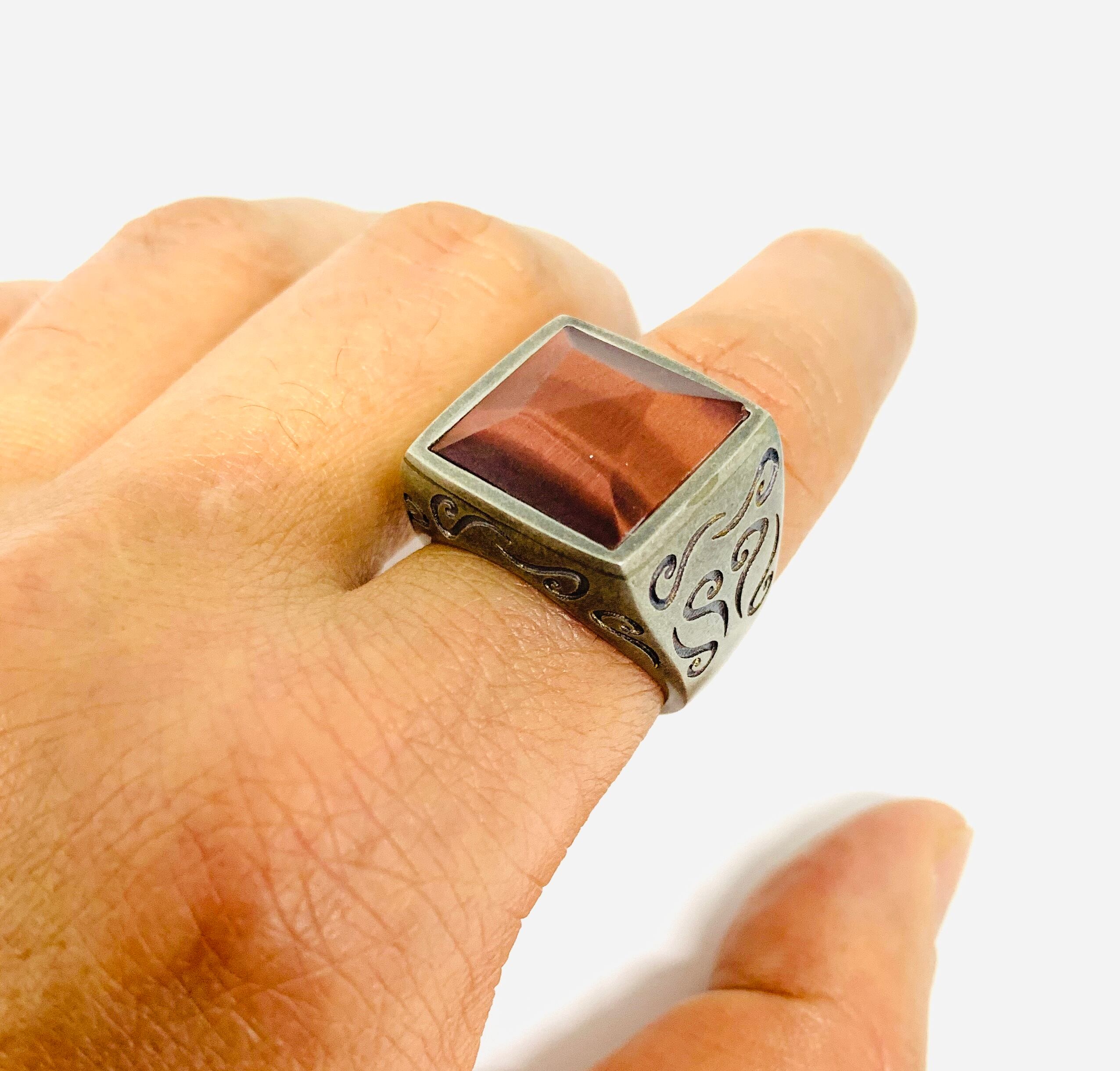 【オススメ シルバーリング!】 ブランド 【MARCO DAL MASO マルコ・ダル・マーゾ】 100% イタリア製 Hand made in Italy 925シルバー(ブラックヴィンテージメッキ仕上げ) ポリッシュ レッドタイガーアイ 最大幅 18mm ※本商品の推奨サイズは実測サイズプラス2号をオススメしております。 ※当サイトのブログ「サイズオーダーについて」を必ずご一読ください!! ※当サイトのブログ「ご使用の注意点とアフターメンテナンス」を必ずご一読下さい!! ※ 在庫がない場合はイタリアオーダーとなります。 納期 / 在庫あり→1週間以内に発送 当ブランドを世に知らしめた代表的コレクション「ARA」は、マオリ語で"変遷"という意味。 柔らかくそれでいて力強い流線紋様は「私たちが経験した過去」と「これから起こる未来」を表し、「今」が大切なことを暗示しています。まさに今、過去と未来の間でたくましく生きる男たちをサポートするコレクション。ミドルフィンガー(中指)もしくはインデックスフィンガー(人差し指)にオススメ。 ジャケパンスタイルからストリートカジュアルまで幅広く楽しめる大人のためのスマートなリング。