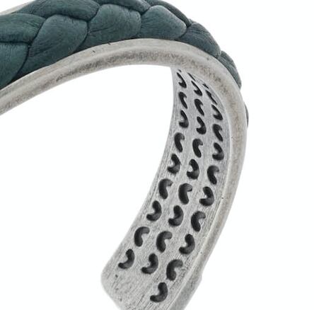 当ブランドの代名詞ともいうべき、本革のイントレッチャート (編み込み)技法を使ったブレスレット。カラーは個性あるダークグリーン。ブラックヴィンテージメッキをバングルの内側にはブランドロゴが刻まれています。